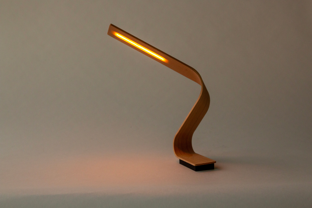 独自の曲げ木技術が描く、躍動感ある造形美。USB充電式のコードレス仕様により、テラスやレストランのテーブルなど、場所を選ばず上質な空間を演出します。