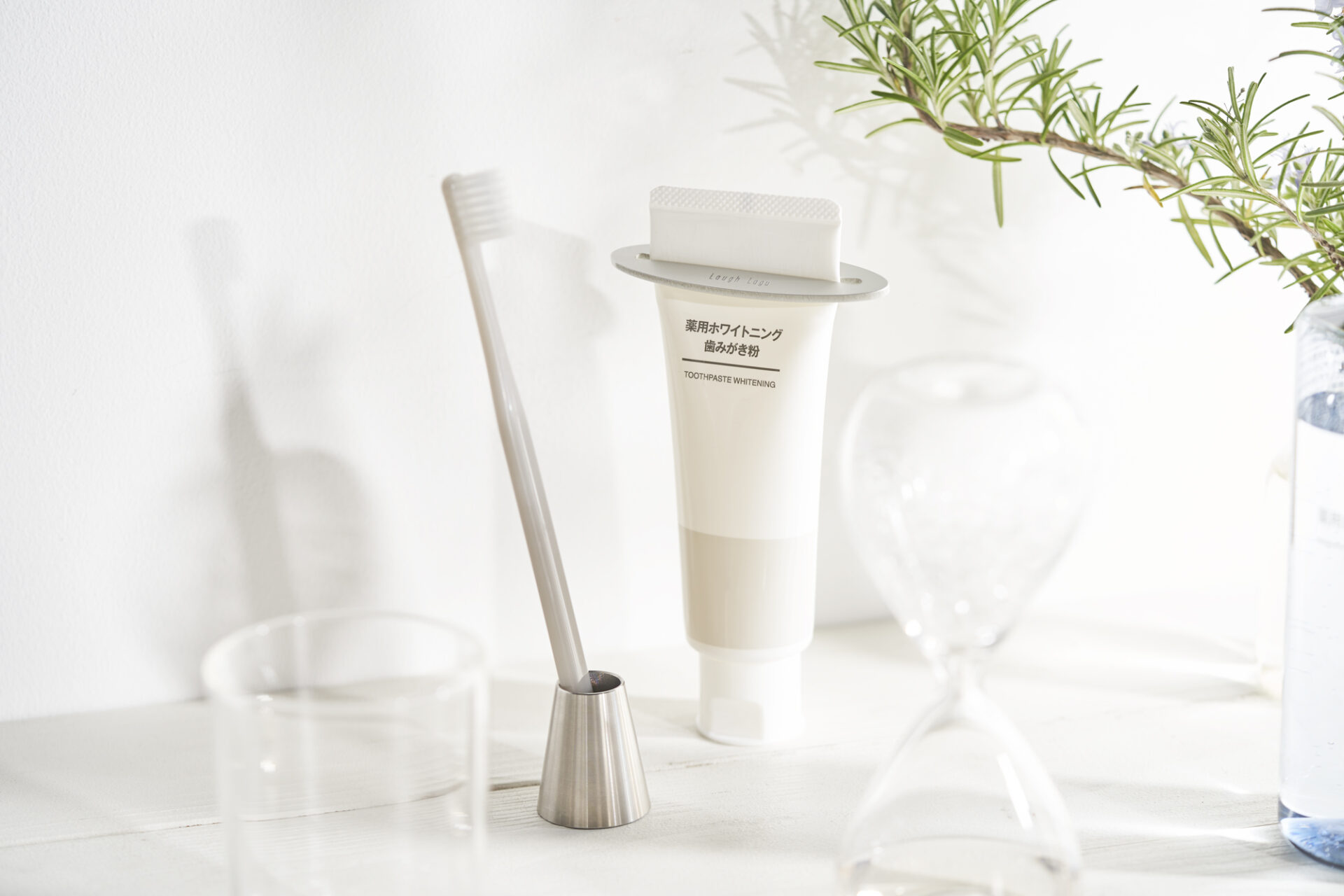 ステンレスの重みで歯ブラシをしっかりと支えます。本体の穴は底面側が狭くなっており、本体を持って移動させる際でも歯ブラシがすり抜けないようになっています。