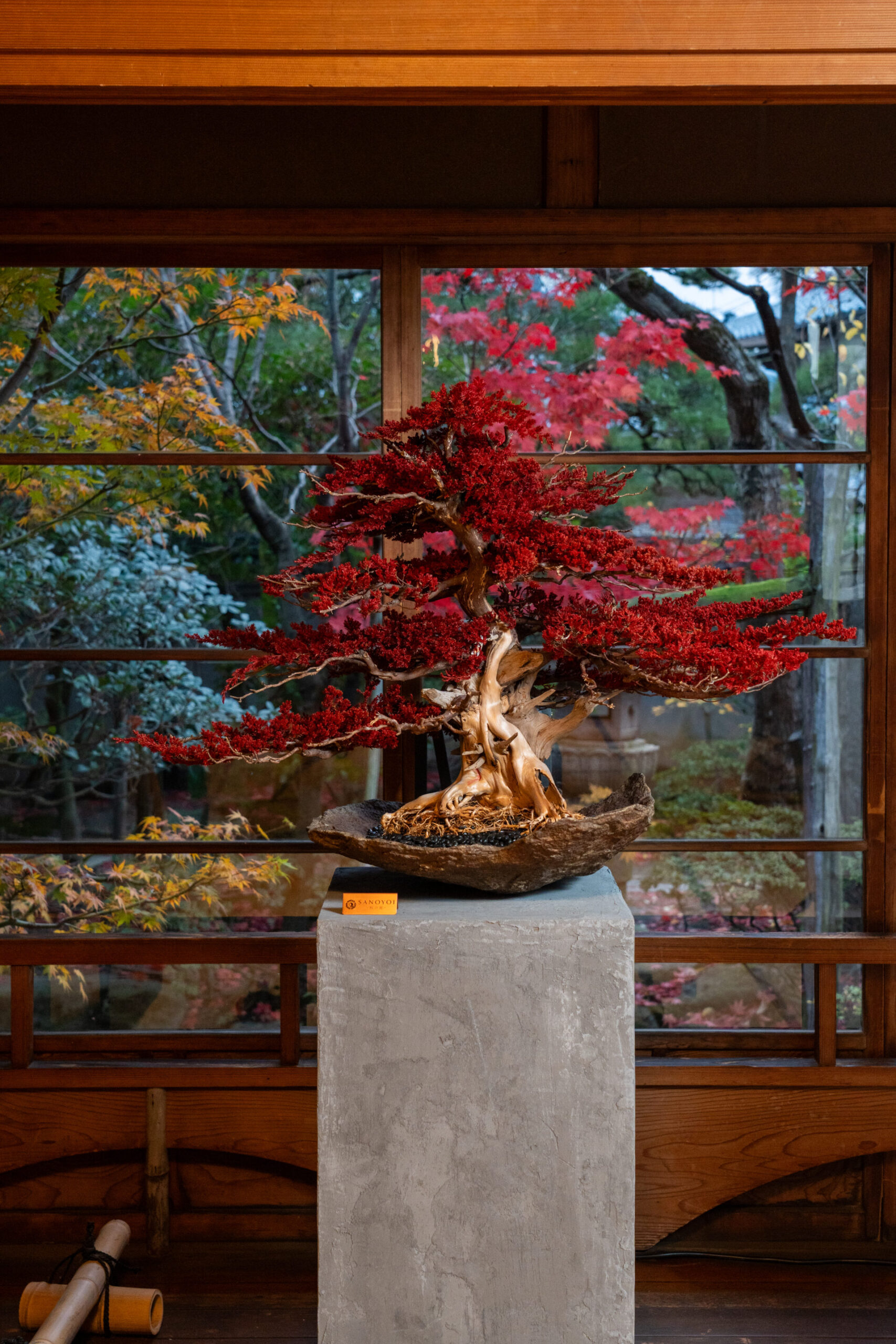 力強く広がる赤い枝葉が、空間の重心となる主景作品。
